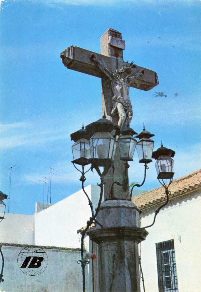 The postcard is of the Christ of the Lanterns located at the Plaza de los Capuchinos in Cordoba, Spain. It was created in 1794 by Juan Navarro Leon.
