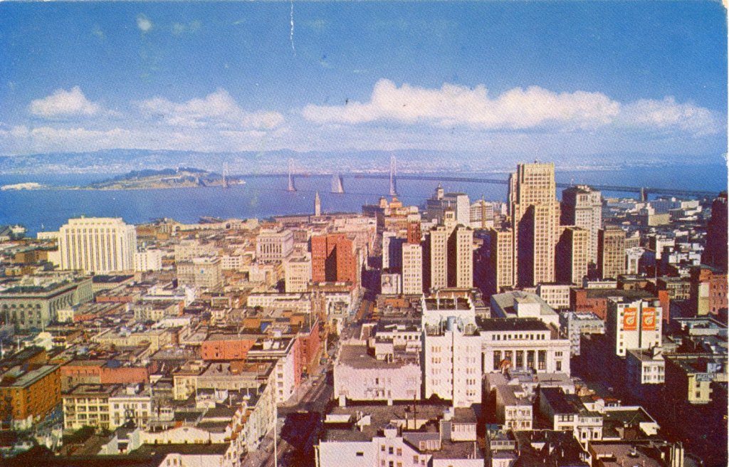 This view as seen from atop Nob Hill shows San Francisco’s financial and business district, the San Franciso-Oakland Bay Bridge, Yerba Buena Island, and the hills of Metropolitan Oakland in the distant background.