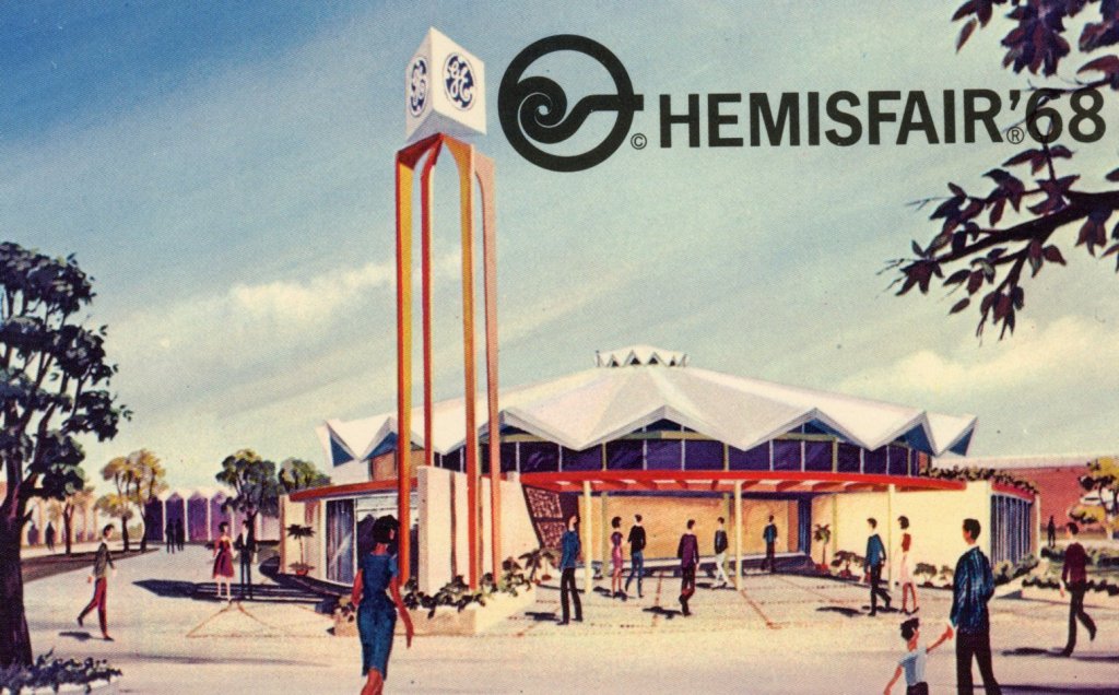 The General Electric Pavilion. In a futuristic building, General Electric presents the story of electrical living in the Southwest from the time the first lights blazed in the San Antonio Opera House to the present.