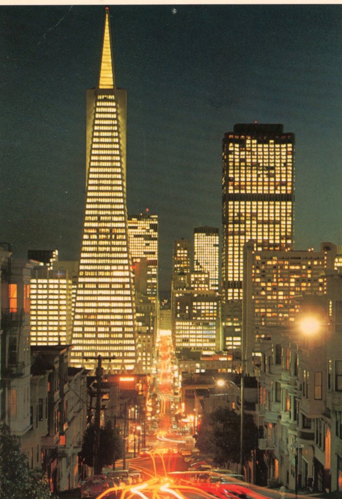 Bright lights and busy streets of the San Francisco skyline. The awe inspiring Transamerica building is flanked on the right by the headquarters of the Bank of America.
