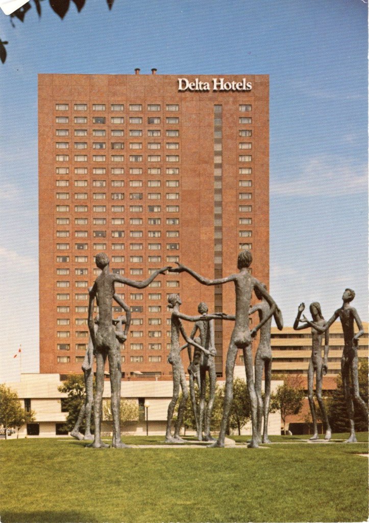 The Delta Bow Valley with the convenient downtown location overlooks both the river and city skyline. Offering 400 first class rooms and outstanding recreational facilities, the Delta Bow Valley is pictured here across from “The Family of Man”, a Calgary landmark.