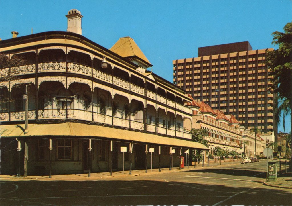 Brisbane, Q. – George Street from Parliament House, showing the Bellevue Hotel, the Terrace Houses, and the Executive building in the background.