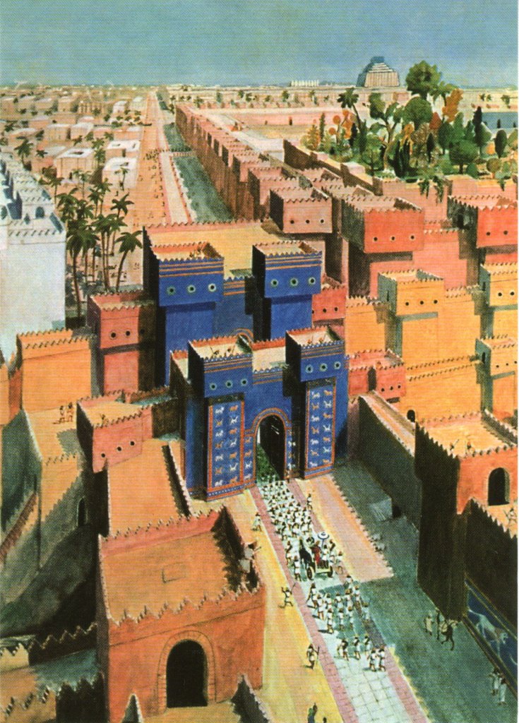 The Gate of Ishtar was also impressive. It was the eighth gate into the City of Babylon in Ancient Mesopotamia (now Iraq). The gate was built by Nebuchadnezzar II in 575 BC. The bricks are glazed and decorated with bas-reliefs of aurochs (extinct species of cattle) and dragons (aslo extinct? just kidding). The gate was excavated by a German archaeological team from 1902-1914 and reconstructed in the Pergamon Museum in Berlin in the 1930s.