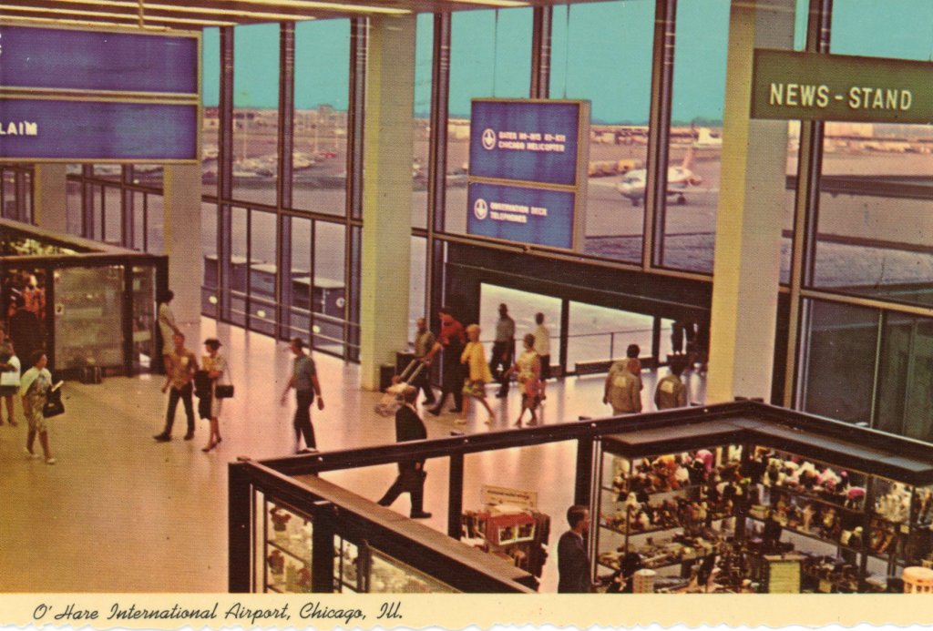 Concourse and News-stand, O’Hare International Airport, Chicago, Illinois. View shows the entrance to one of the numerous concourses leading to the planes. Approximately 34 million passengers pass through O’Hare annually making it the world’s busiest airport.