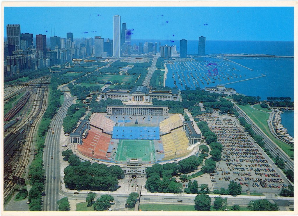 A bird’s-eye view of Soldiers Field, the home of Chicago Bears of the National Football League. To the north is the dramatic Chicago skyline along the shore of beautiful Lake Michigan.
