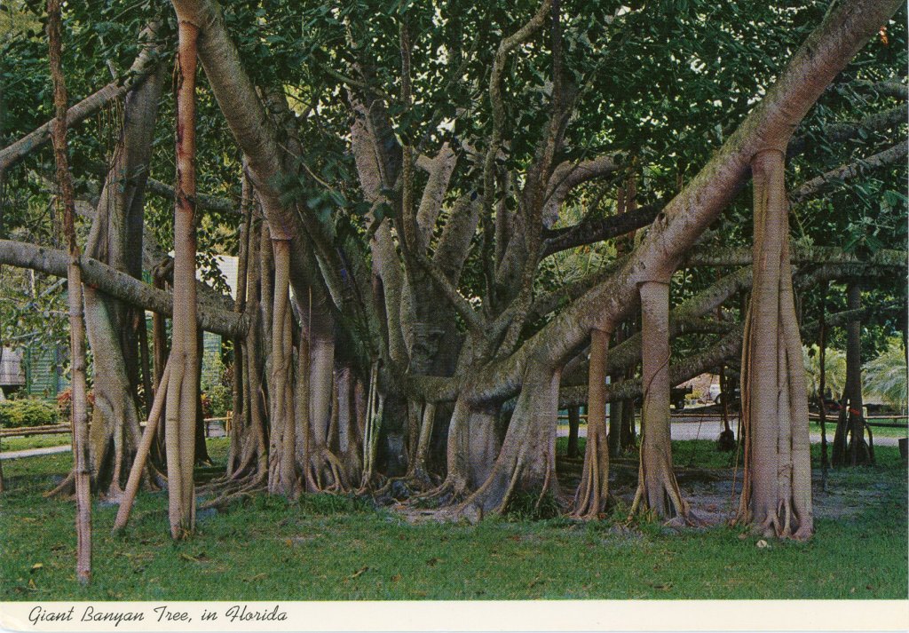 The banyan is one of Florida’s most curious trees, which sprouts even from a seed dropped on the limb of any other tree by birds. The roots descend to the soil and in time kill the tree on which they grow. Then as the branches develop, these throw down supports which take root as soon as they touch the ground, enlarge into trunks and extend branches in their turn to all sides of the parent tree. Some of these trees grow to very large proportions.