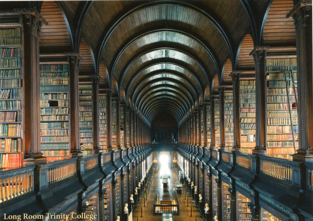 The Long Room, Trinity College, Dublin. The main chamber of the Old Library, the Long Room, is nearly 65 meters in length, and houses around 200,000 of the library’s older books. In 1860, the roof was raised to allow the construction of the present barrel-vaulted ceiling and gallery bookcases. Marble busts are placed down either side of the room which also contains the older surviving harp in Ireland.