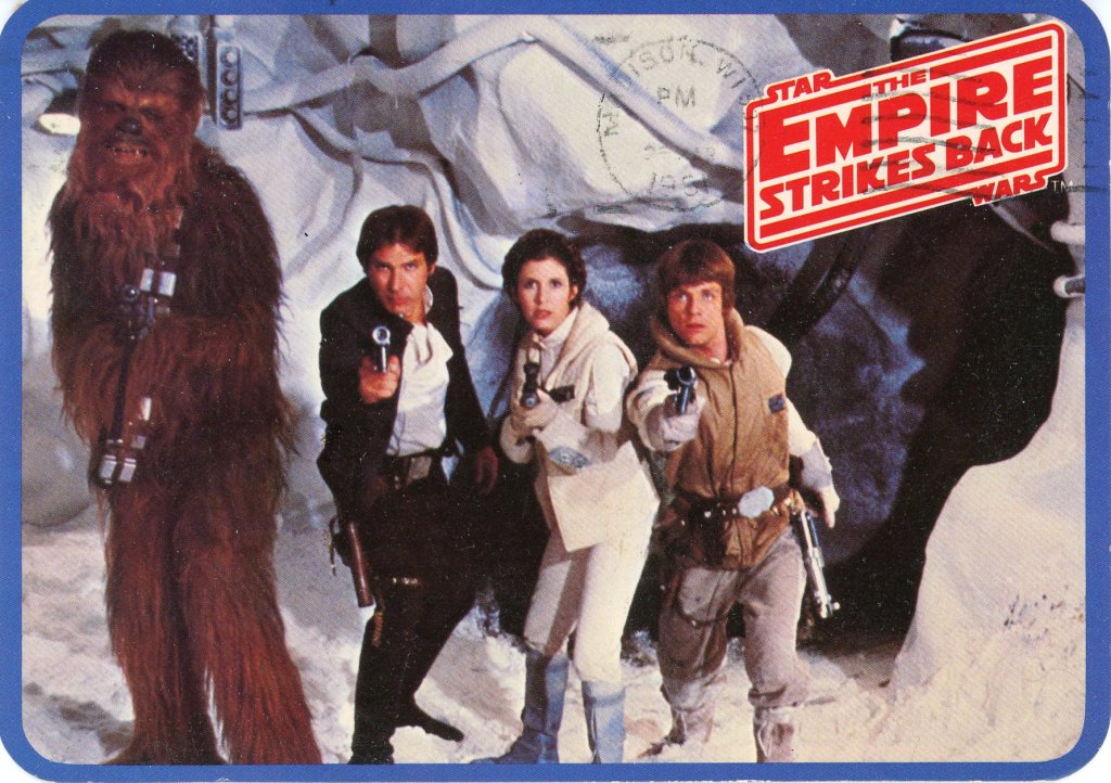 Chewbacca (Peter Meyhew), Han Solo (Harrison Ford), Princess Leia Organa ( Carrie Fisher and Luke Skywalker (Mark Hamill) at the Rebel base on the ice planet, Hoth, in the movie The Empire Strikes Back.
