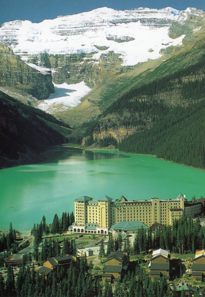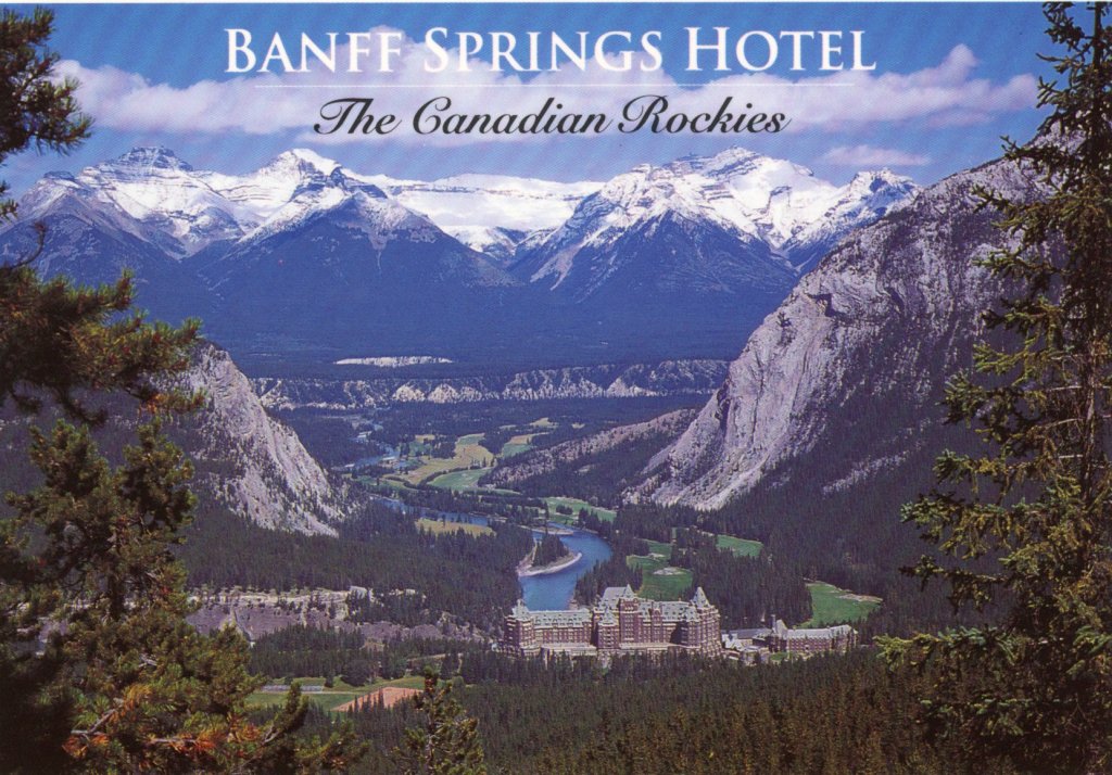 The Banff Springs Hotel and the Bow Valley – The Banff Springs Hotel has one of he most spectacular settings in the world, surrounded by mountains and overlooking the Bow River and its own world class golf course. In the view Tunnel Mountain is on the left, Mt Rundle on the right, and the Fairholme Range in the distance.