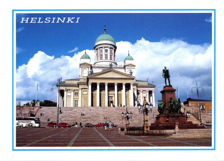 This is the Lutheran Cathedral in Helsinki. It is very stark inside – all white. The prettiest thing about it is the organ. The statue is of Alexander 2 of Russia.