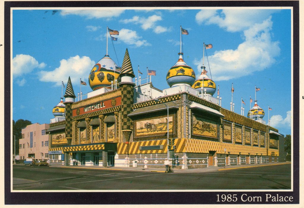 Here we are in the middle of South Dakota at Al’s Oasis Inn watching a Dracula movie on Saturday night – Allie and Val are screaming but it is really a comedy! So far we have seen the Corn Palace and lots of farmland. Astra is traveling well as usual. Tomorrow we will go on to the Badlands for a night and then to the Back Hills. Allie and Val have been saving their allowances and have been to two gift shops already, while Astra and I wait elsewhere. We had a good time at Valleyfair, the amusement park, with Tom and Jenny on Thursday before we left – spent 10 hrs there!