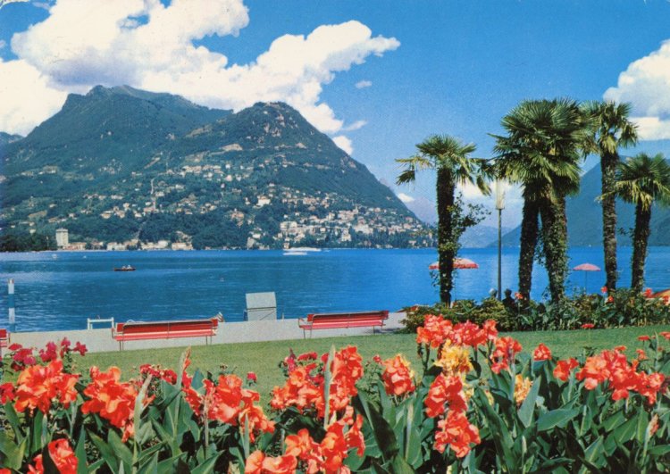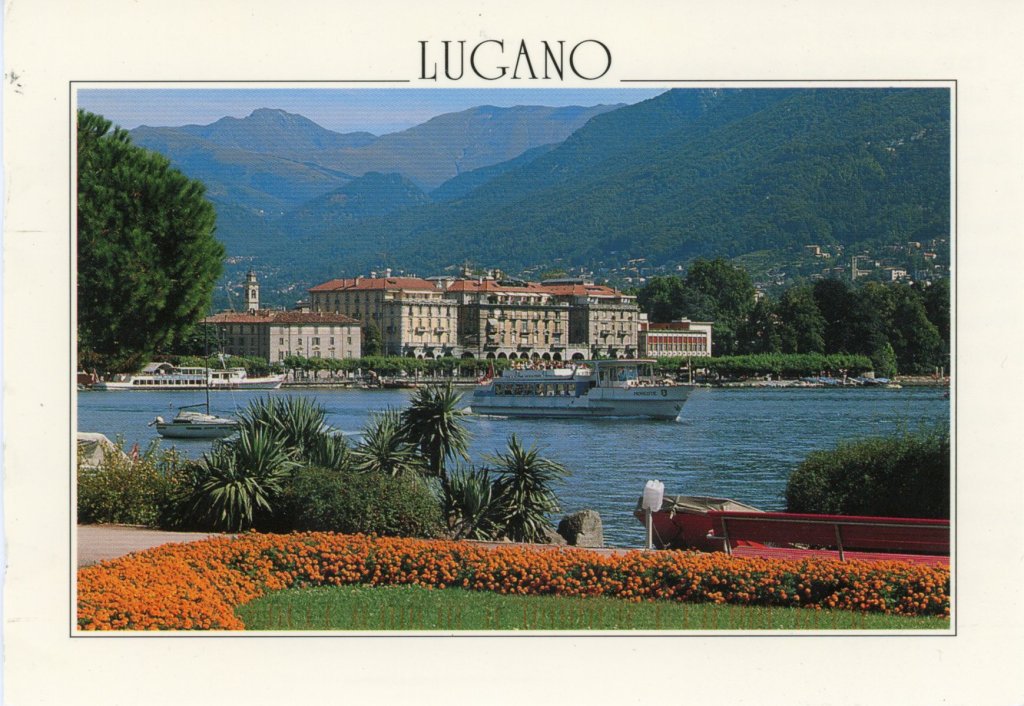 This is the view from our balcony! Very resort-like! Warm.. flowers everywhere. We went to the top of San Salvatore this morn. on a cog railroad…the view was lovely. Have just finished eating lunch and are waiting to take a boat trip on the lake. Bill has dental app. so he is not going. Kathy and Jane are not going either. Yesterday we left Zurich at 7 am and the ride through the Alps was fantastic! Just unbelievable!! We got here about 10 am and went to Kathy’s school, she showed us around…then came back to hotel with us. We took a walk along the lake after lunch and rested in aft. The hotel has a nice pool. It is so nice to be with people who can help us with language problems, ordering food, etc. So far the kids are getting along fine. Steve even said he was glad he came!