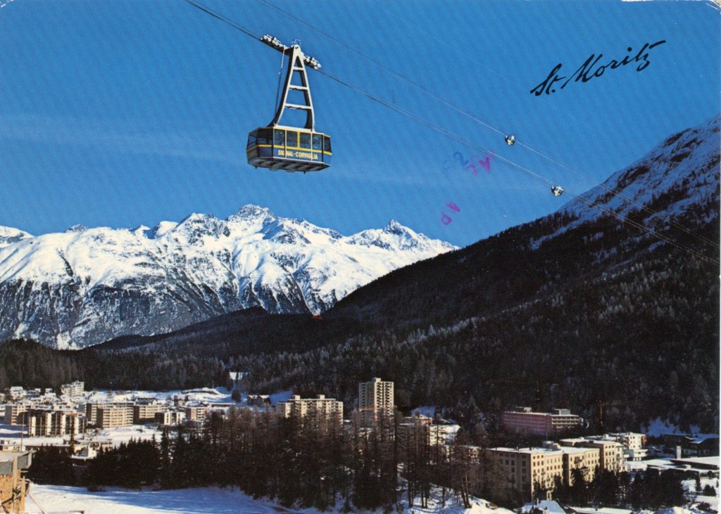 This postcard is from a friend of mine who was not in St Moritz at all. He was in San Francisco at the time. But I knew him when we both spent time in St Moritz. My first experience with skiing was in St Moritz. I was in boarding school and my parents were living in Africa. My school spent two weeks skiing in St Moritz every winter so I went directly from Nigeria – tropical Africa – to Switzerland with no warm, winter clothes. I layered on my blue jeans and sweatshirts and was freezing most of the time.