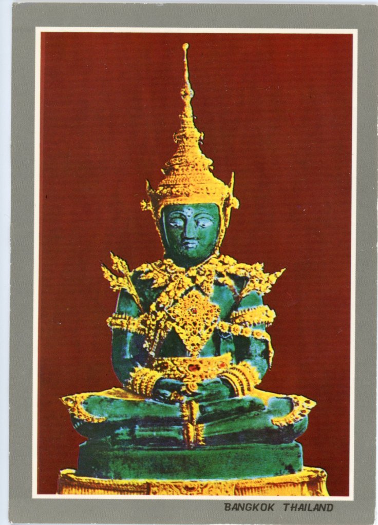 The image of the Emerald Buddha under Summer season attire inside Wat Phra Keo at the Royal Place grounds, Bangkok.