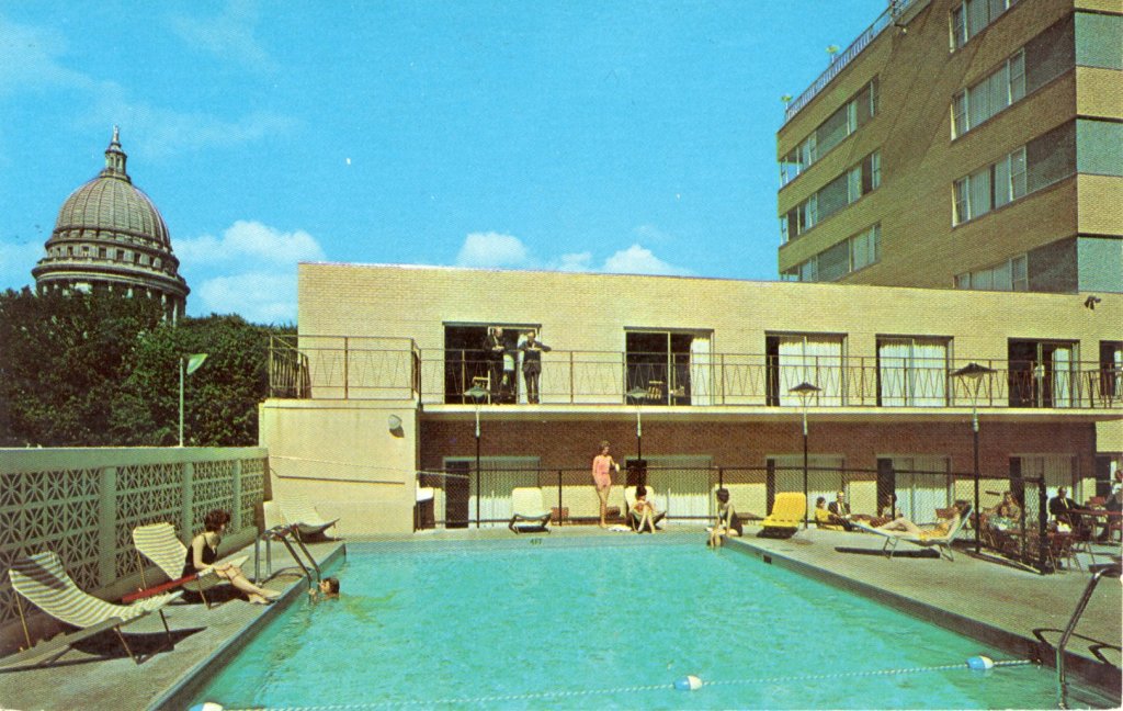 At the beautiful new Park Motor Inn, Madison Wisconsin. Swimming in downtown Madison in the shadow of Wisconsin’s Capitol Dome. Cabana type rooms overlooking pool and sun-deck. A resort in downtown Madison, the Capital of Vacationland – Wisconsin.